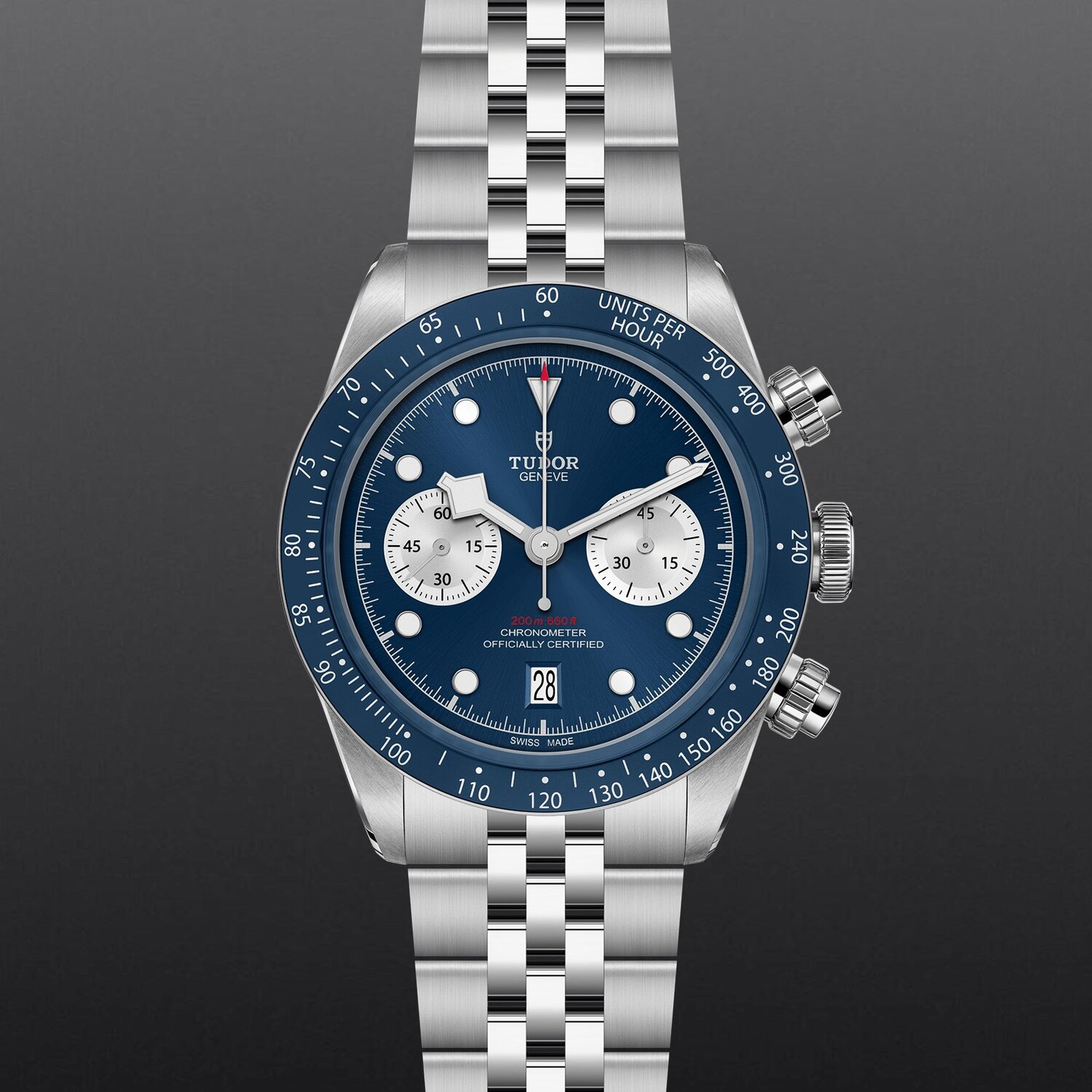 Stainless steel screw-down winding crown with the TUDOR rose in relief Stainless steel screw-down pushers at 2 o'clock and 4 o'clock